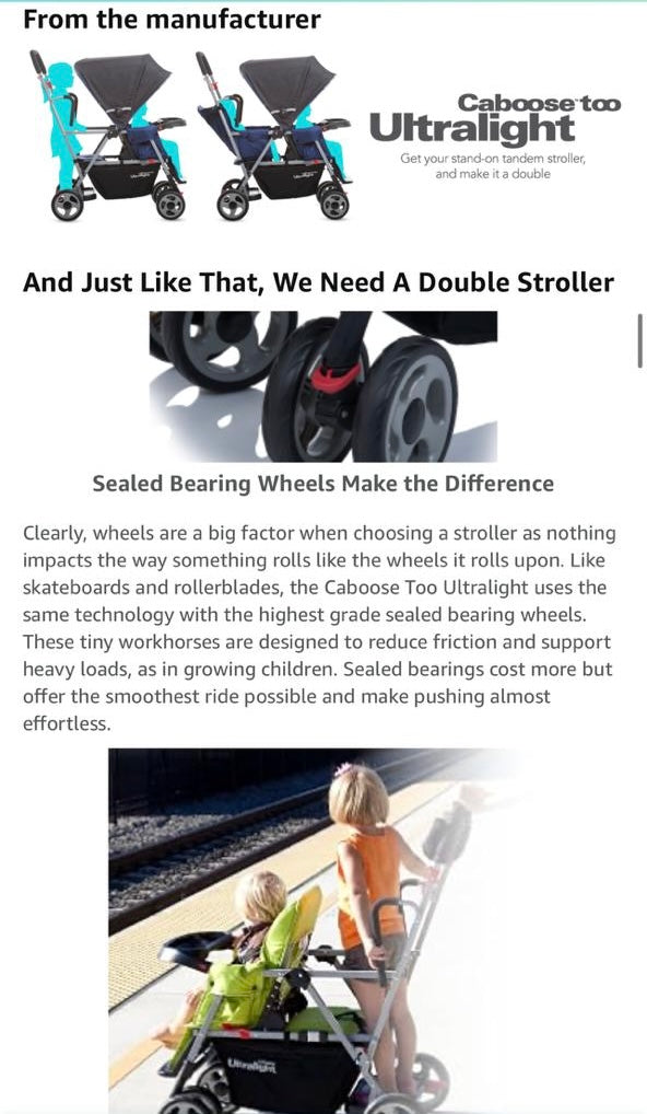 The Caboose Too Ultralight is a versatile double stroller that offers the size, weight and maneuverability of a single stroller without compromising features. It's designed to stroll with two children of different ages and its a whole lot of fun too!